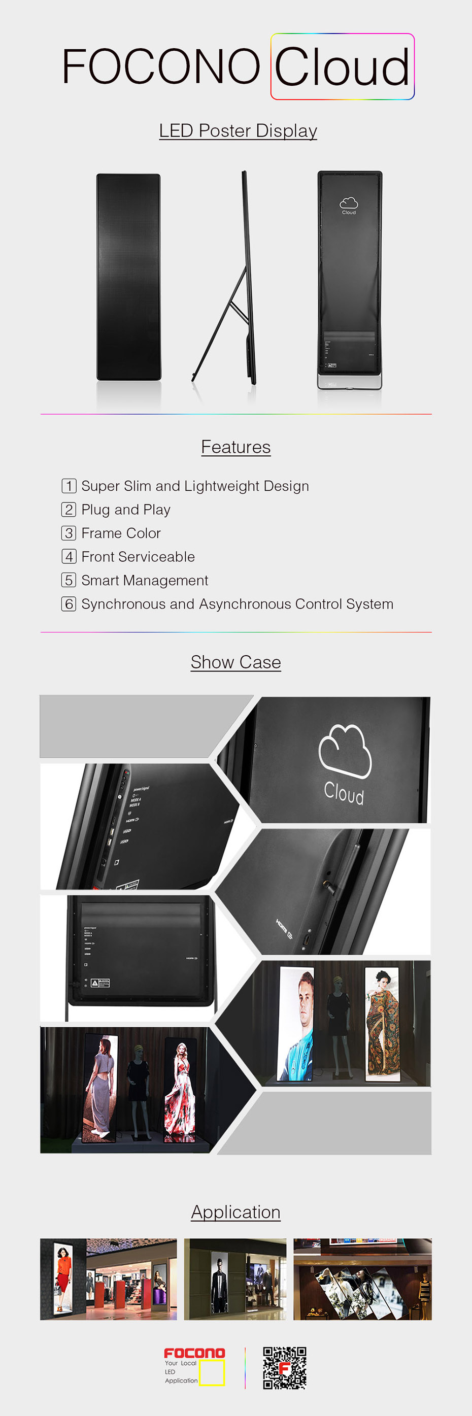 FOCONO full-color LED Poster Display, lightweight design, portable, stylish and fashionable avant-courier, easy to use. Intelligent pattern is in control of all the global picture. Front serviceable, effective quick, synchronous and asynchronous control system realize the same picture of many machine. It is widely used in shopping malls, hotels and bank halls. The content of the picture is novel and changeable. It has a great effect on the eyes and the promotion effect is better.