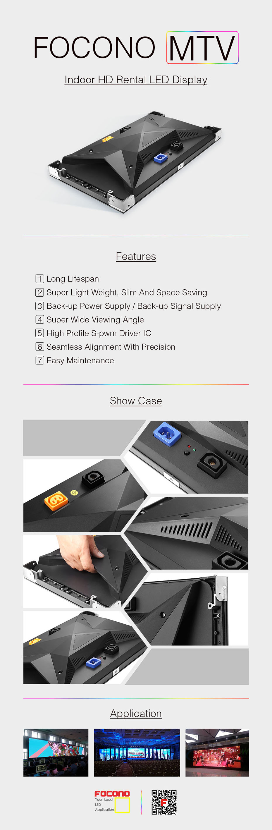 FOCONO MTV, high definition small pixel rental LED display. Elegant design; seamless alignment, long lifespan, slim and space saving; lower power consumption, best choice for energy efficiency; high end S-PWM driver IC, high resolution, high refresh rate, no shadow; high quality black smd, high contrast ratio and great image; easy maintenance design, saving time and labor.