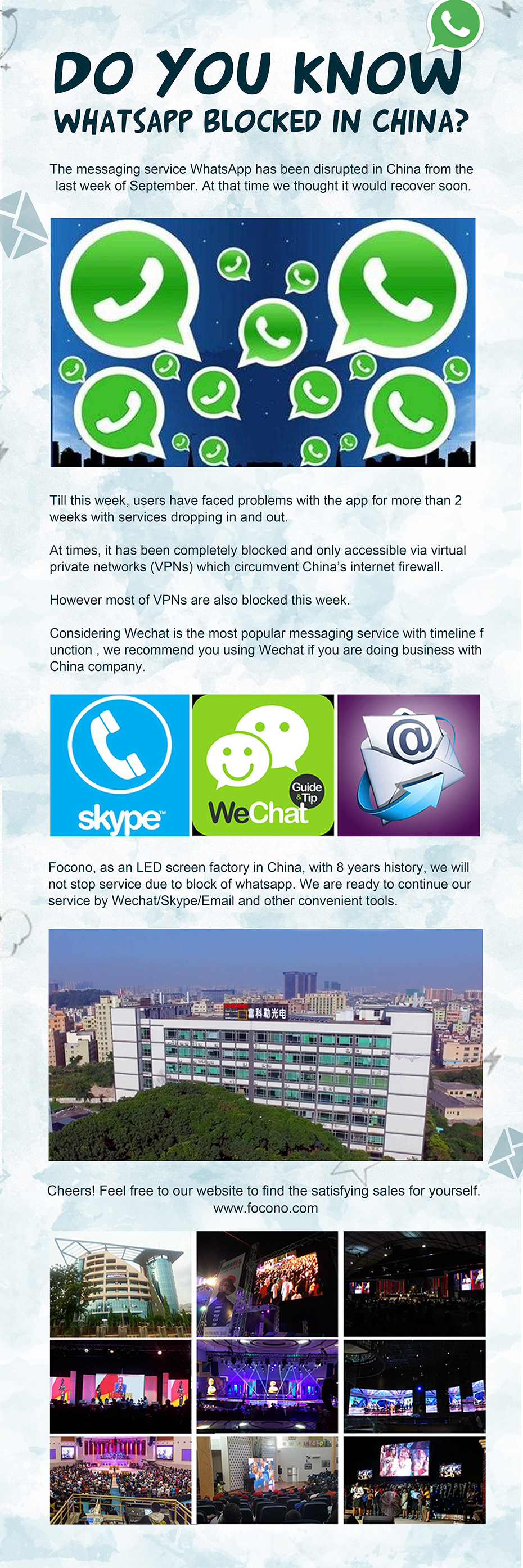 Do You Know WhatsAPP Blocked In China? Release Time:2017-10-20 PREVIOUS:E-Era, All Of US Era NEXT:FOCONO New Products Sales Promotion Is Coming!